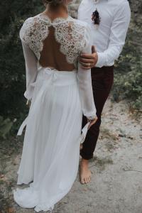 robe de mariée dos nu en dentelle et manche en mousseline de soie