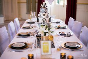 decoration de table thème gatsby assiettes dorées et noires. weedingcake noir et blanc