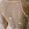 Le corsage est réalisé en tulle brodé, avec des motifs floraux et géométriques qui captent la lumière et subliment la silhouette. Chaque broderie est minutieusement cousue à la main, offrant un équilibre parfait entre modernité et finesse artisanale.